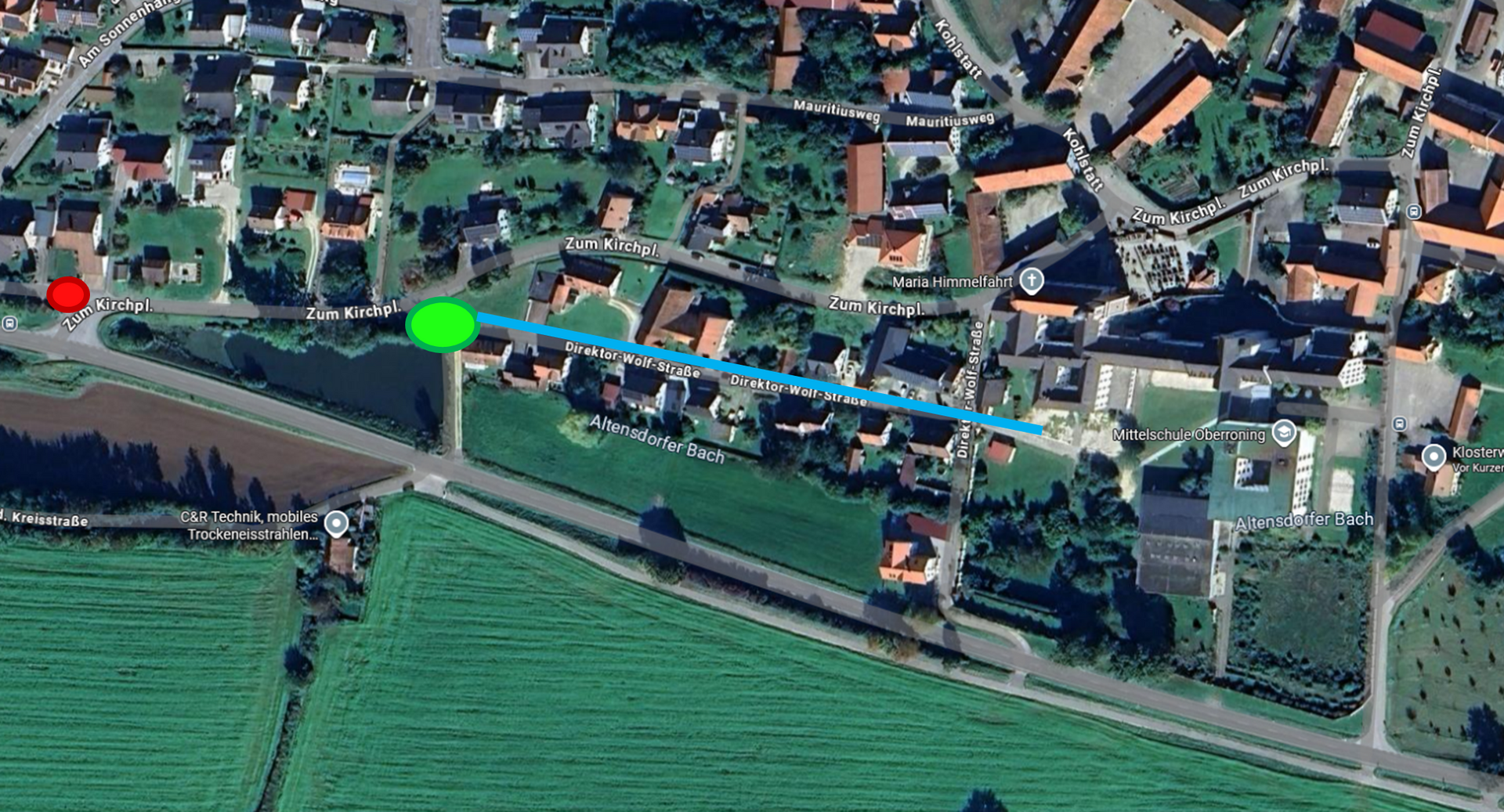 Sollten Sie einen dringenden Grund haben, Ihr Kind selbst an die Schule zu bringen, ohne dass es real in der Gehfähigkeit eingeschränkt ist, so lassen Sie Ihren Sohn oder Ihre Tochter bitte unbedingt an der vorderen Bushaltestelle mit Bushäuschen am „Zum Kirchplatz“ (rote Markierung) aussteigen.